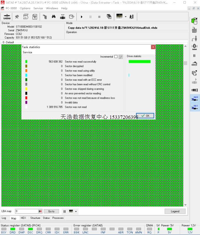 解决方案:收到硬盘后,在无尘环境更换兼容的磁头,接到数据恢复工具ACE PC3000 UDMA EXPRESS上,通电认盘,分头镜像,最后硬盘内的重要数据完美恢复!