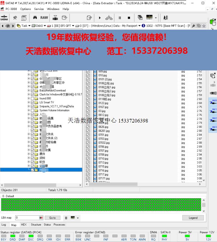 解决方案:收到硬盘后,我们在无尘环境拆开,发现盘片上有灰,清洗盘片后,更换兼容的磁头,原板解锁飞线,再接到专业数据恢复工具ACE PC3000 UDMA EXPRESS上,通电硬盘正常认盘,备份好关键固件后,做好镜像前的处理工作后,DE分头镜像,最后客户硬盘内重要数据大部分成功恢复!