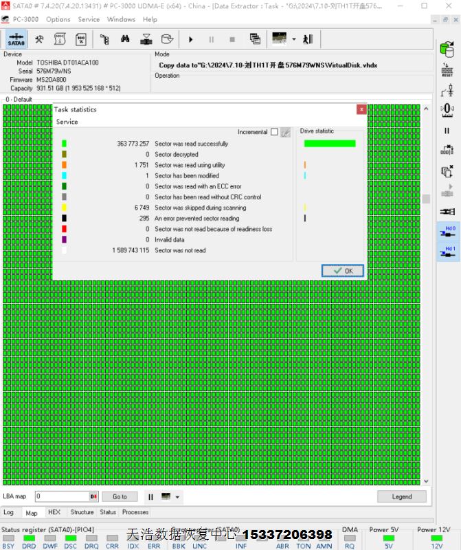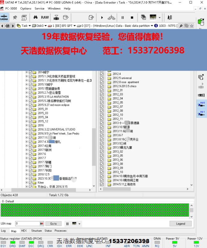 解决方案:收到硬盘后,在无尘环境拆开,更换兼容的磁头,接到专业数据恢复工具ACE PC3000 UDMA EXPRESS上,通电硬盘正常认盘,备份好固件,DE分头镜像,最后客户硬盘的重要数据绝大部分都成功恢复!