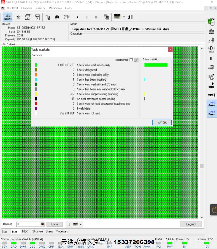 解决方案:收到硬盘后,在无尘环境拆开硬盘,发现盘片0面有一圈划伤,清洗盘片后,更换兼容的磁头,通过F3热交换处理方法,最后客户硬盘内重要数据基本完整恢复!