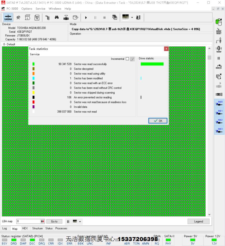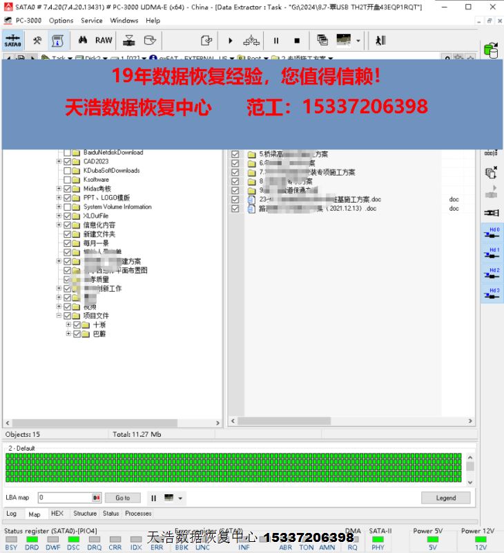 解决方案:收到硬盘后,我们在无尘环境更换兼容的磁头,更换兼容的SATA电路板,接到数据恢复工具PC3000 UDMA EXPRESS上,再通电声音正常认盘正常,DE镜像,成功恢复客户硬盘内几乎全部重要数据。