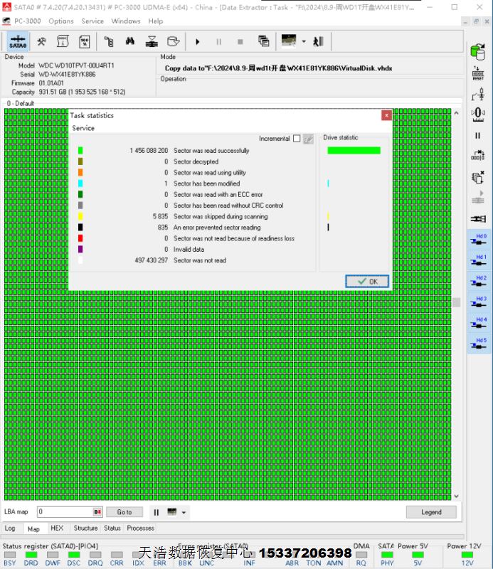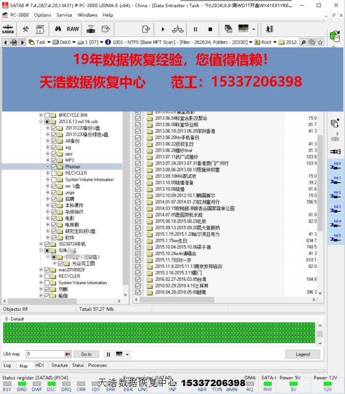 解决方案:收到硬盘后,在无尘环境拆开,发现5号盘片划伤,清洗盘片后,更换兼容的磁头,接到专业数据恢复工具PC3000 UDMA EXPRESS上,通电硬盘认盘,备份好关键固件,做好前期处理工作后,DE分头镜像,最后客户硬盘内的重要数据大部分成功恢复!