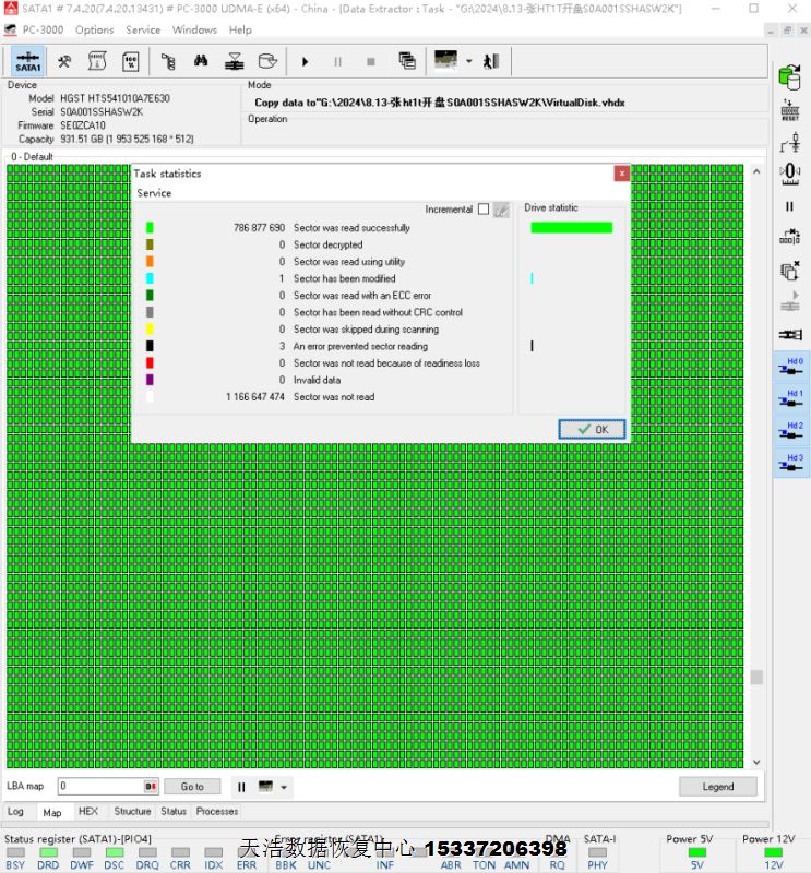 解决方案:收到硬盘后,在无尘环境更换兼容的全好磁头,接到数据恢复工具PC-3000 UDMA Express上,通电硬盘正常认盘,数据区前后都能正常访问,备份好固件,做好恢复前的准备工作后,DE分头镜像,最后成功恢复客户硬盘内全部重要数据!