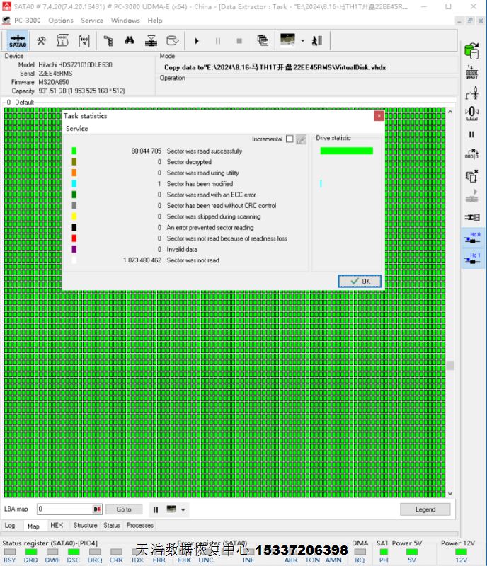 解决方案:收到硬盘后,在无尘环境拆开,更换兼容的磁头,接到专业数据恢复工具ACE PC3000 UDMA EXPRESS上,通电硬盘正常认盘,备份好固件,DE分头镜像,最后客户硬盘内的重要数据基本完美恢复!