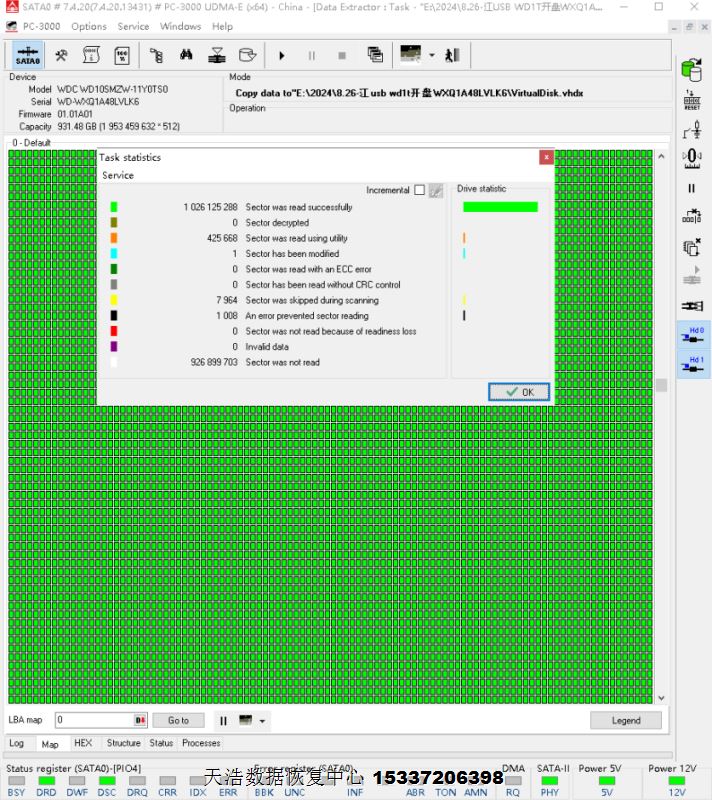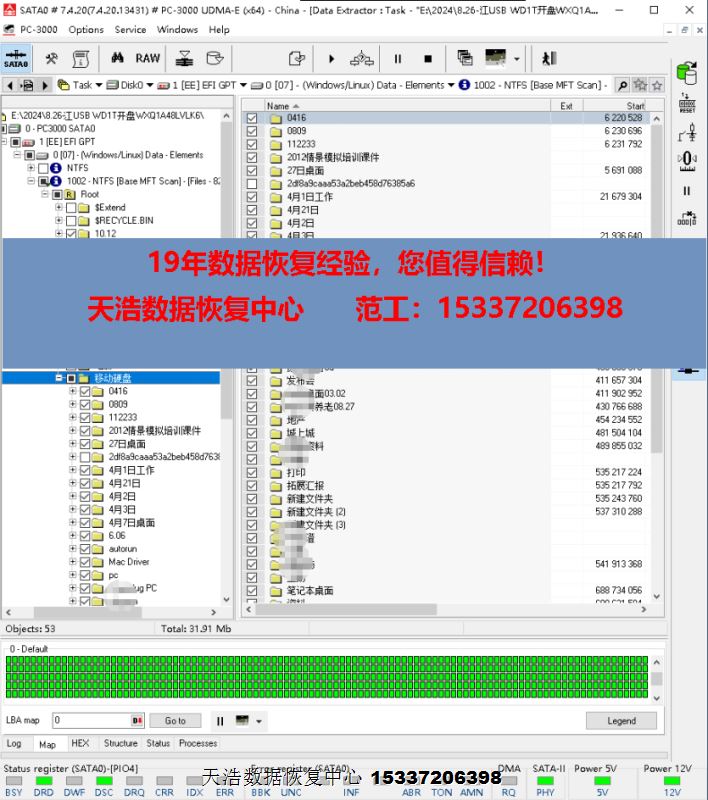 解决方案:收到硬盘后,在无尘环境更换兼容的磁头,更换兼容的SATA电路板,接到专业数据恢复工具ACE PC-3000 UDMA Express上,通电硬盘认盘,备份好关键固件,做好前期处理工作后,DE分头镜像,最后客户硬盘内重要数据大部分成功恢复!