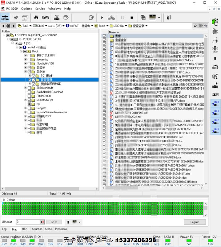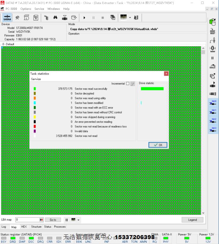 解决方案:收到硬盘后,接到数据恢复工具PC-3000 UDMA Express上,使用F3热交换技术处理后,硬盘数据区前后均能能正常访问,DE分头镜像,最后客户硬盘内重要数据完美成功恢复!