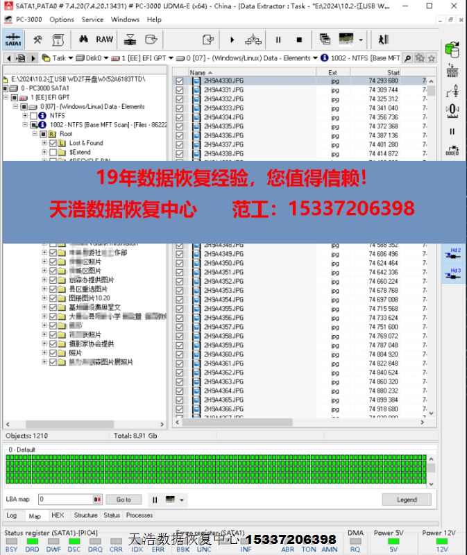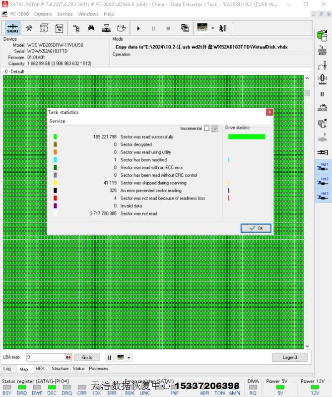 解决方案:收到硬盘后,在无尘环境更换兼容的磁头,原始usb板解锁,飞线改SATA,接到专业数据恢复工具ACE PC-3000 UDMA Express上,通电硬盘认盘,备份好关键固件,做好前期处理工作后,DE分头镜像,最后客户硬盘内重要数据大部分成功恢复!