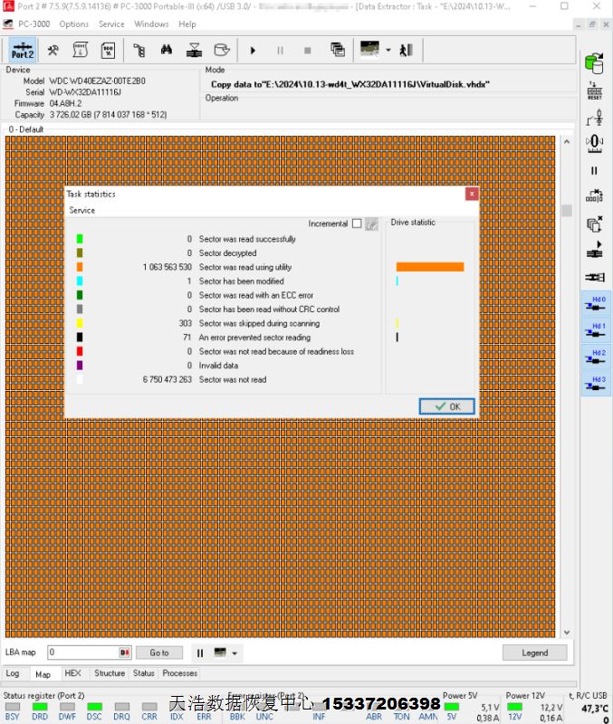 解决方案:收到硬盘后,在无尘环境更换兼容的磁头,接到专业数据恢复工具ACE PC-3000 Portable-III上,原板解锁,通电检测、修复固件后,硬盘正常认盘,DE分头镜像,成功恢复硬盘内客户公司几乎全部数据!