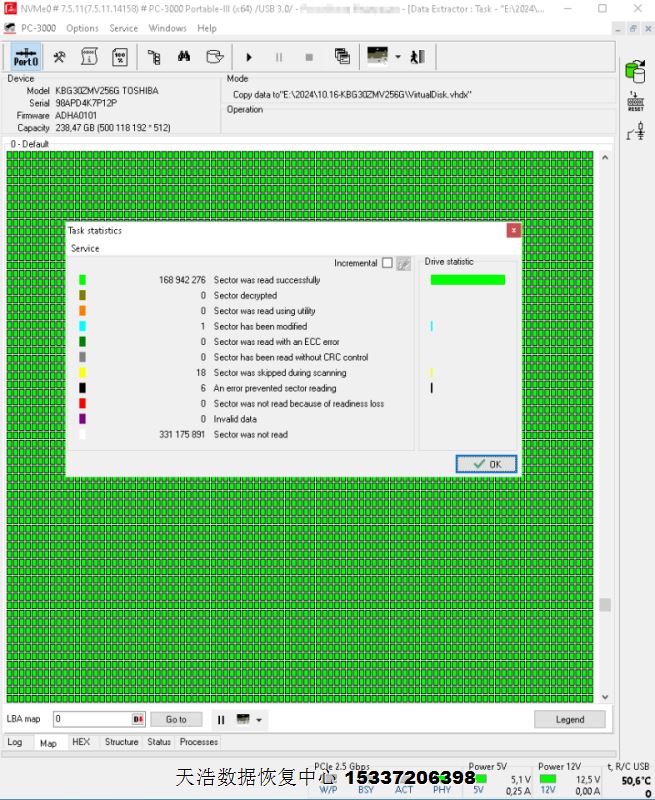 解决方案:收到硬盘后,我们接到专业的SSD恢复工具ACE PC-3000 Portable3上,用PC3000 DE虚拟镜像,最后客户硬盘内的重要数据基本完整恢复!