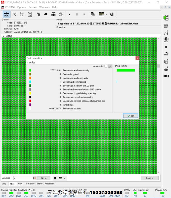 解决方案:收到硬盘后,在无尘环境拆开硬盘,更换兼容的磁头,接到数据恢复工具ACE PC3000 UDMA EXPRESS上,通电认盘DE分头镜像,最后客户硬盘内的重要数据基本完整恢复!