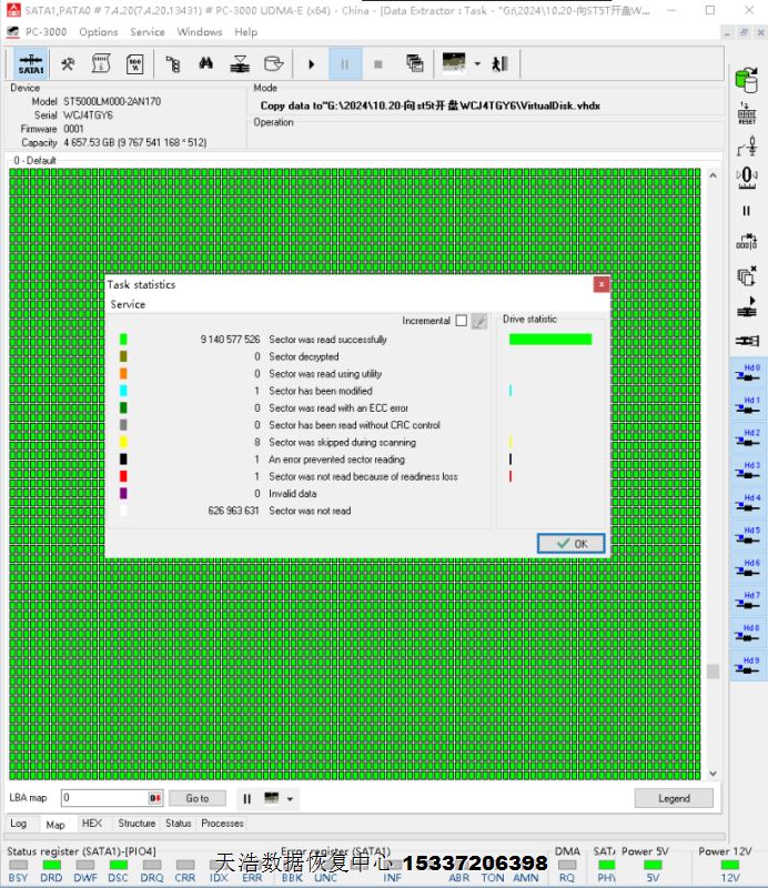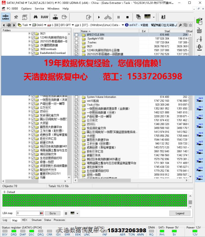 解决方案:收到硬盘后,在无尘环境更换兼容的碰头,接到数据恢复工具PC-3000 UDMA Express上,硬盘正常认盘,数据区前后都能正常访问,备份好固件,做好镜像前的处理工作,DE分头镜像,成功恢复客户硬盘内几乎全部重要数据!