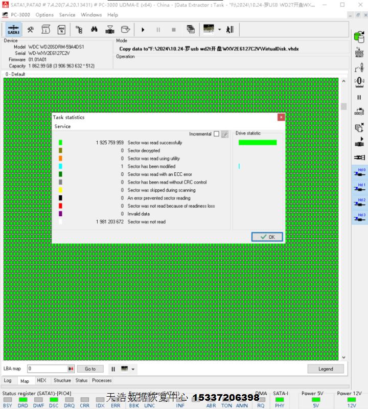 解决方案:收到硬盘后,我们在无尘环境开盘,更换兼容的磁头,原始usb板解锁飞线改SATA,接到专业数据恢复工具ACE PC3000 UDMA EXPRESS上,通电硬盘正常认盘,备份好关键固件后,做好镜像前的处理工作后,DE分头镜像,最后客户硬盘内重要数据基本完整恢复!