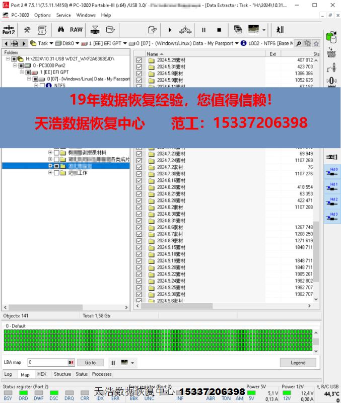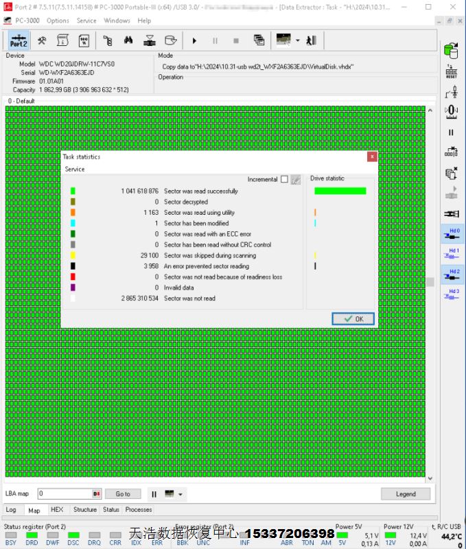 解决方案:收到硬盘后,我们在无尘环境开盘,更换兼容的磁头,原始usb板解锁飞线改SATA,接到专业数据恢复工具ACE PC-3000 Portable3上,通电硬盘正常认盘,备份好关键固件后,做好镜像前的处理工作后,DE分头镜像,最后客户硬盘内重要数据大部分成功恢复!