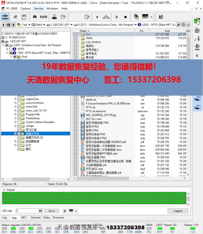 解决方案:收到硬盘后,在无尘环境拆开,更换兼容的磁头,接到专业数据恢复工具PC3000 UDMA EXPRESS上,原始usb板解锁、飞线改SATA,通电硬盘认盘,备份好关键固件,做好前期处理工作后,DE分头镜像,最后客户硬盘内的重要数据基本完美恢复!