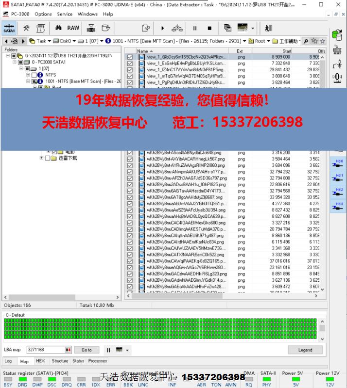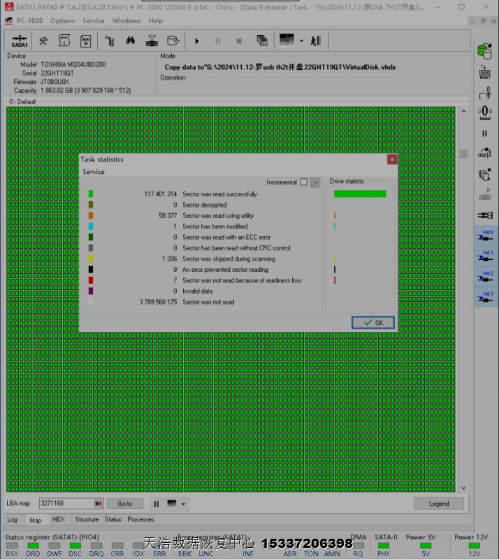 解决方案:收到硬盘后,我们在无尘环境更换兼容的磁头,更换兼容的SATA电路板,接到数据恢复工具PC3000 UDMA EXPRESS上,再通电声音正常认盘正常,DE镜像,成功恢复客户硬盘内大部分重要数据。