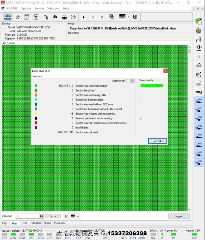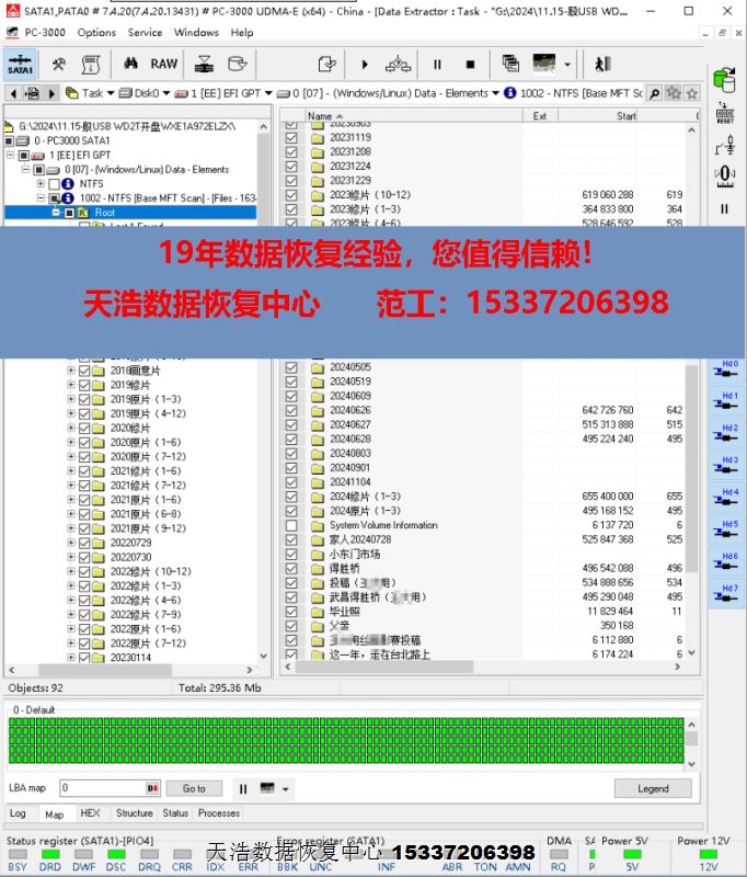 解决方案:收到硬盘后,在无尘环境更换兼容的磁头,更换兼容SATA电路板,接到专业数据恢复工具ACE PC-3000 UDMA Express上,通电硬盘认盘,备份好关键固件,做好前期处理工作后,DE分头镜像,最后客户硬盘内多年的照片视频数据基本完整恢复!