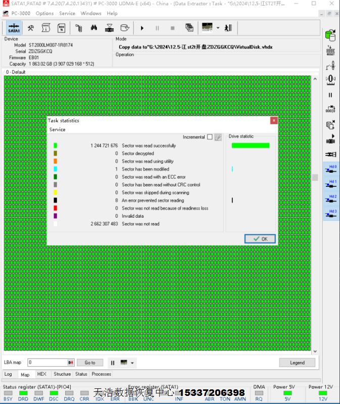 解决方案:收到硬盘后,在无尘环境更换兼容的全好磁头,接到数据恢复工具ACE PC-3000 UDMA Express上,通电硬盘不认盘,检测发现固件也问题,备份修复固件后,再断电通电,硬盘正常认盘,做好恢复前的固件处理工作后,DE分头镜像,最后客户硬盘内重要数据基本完美恢复!