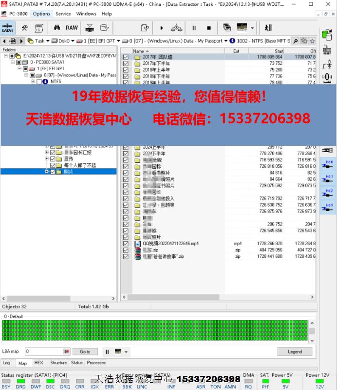 解决方案:收到硬盘后,我们在无尘环境开盘,更换兼容的磁头,原始usb板解锁飞线改SATA,接到专业数据恢复工具ACE PC3000 UDMA EXPRESS上,通电硬盘正常认盘,备份好关键固件后,做好镜像前的处理工作后,DE分头镜像,最后客户硬盘内重要数据大部分成功恢复!