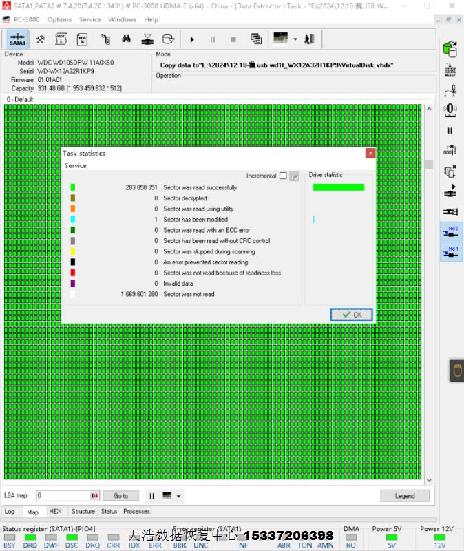 解决方案:收到硬盘后,原始usb板解锁、飞线改SATA,接到专业数据恢复工具PC3000 UDMA EXPRESS上,通电硬盘不认盘,备份检测修复好固件后,再断电通电,硬盘正常认盘,做好前期处理工作后,DE分头镜像,最后客户硬盘内的重要数据基本完美恢复!