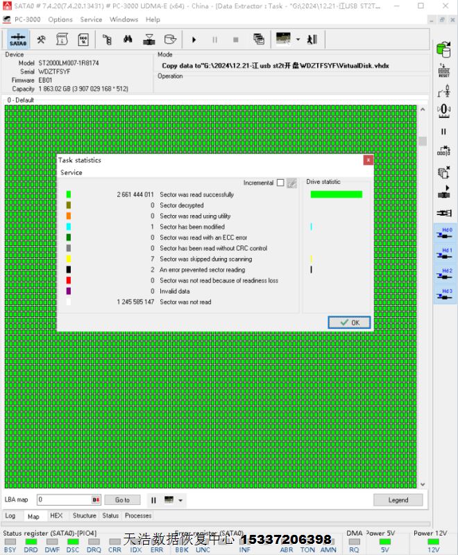 解决方案:收到硬盘后,在无尘环境更换兼容的磁头,再接到数据恢复工具ACE PC-3000 UDMA Express上,通电硬盘正常认盘,备份关键固件后,做好恢复前的固件处理工作后,DE分头镜像,最后客户硬盘内重要数据基本完美恢复!