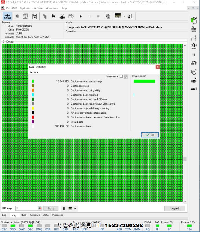 解决方案:收到硬盘后,在无尘环境开盘更换兼容的磁头,接到数据恢复工具ACE PC-3000 UDMA Express上,通电认盘,DE分头镜像,最后客户硬盘内的重要数据基本完整恢复!包含超越软件的数据库,经验证也ok!