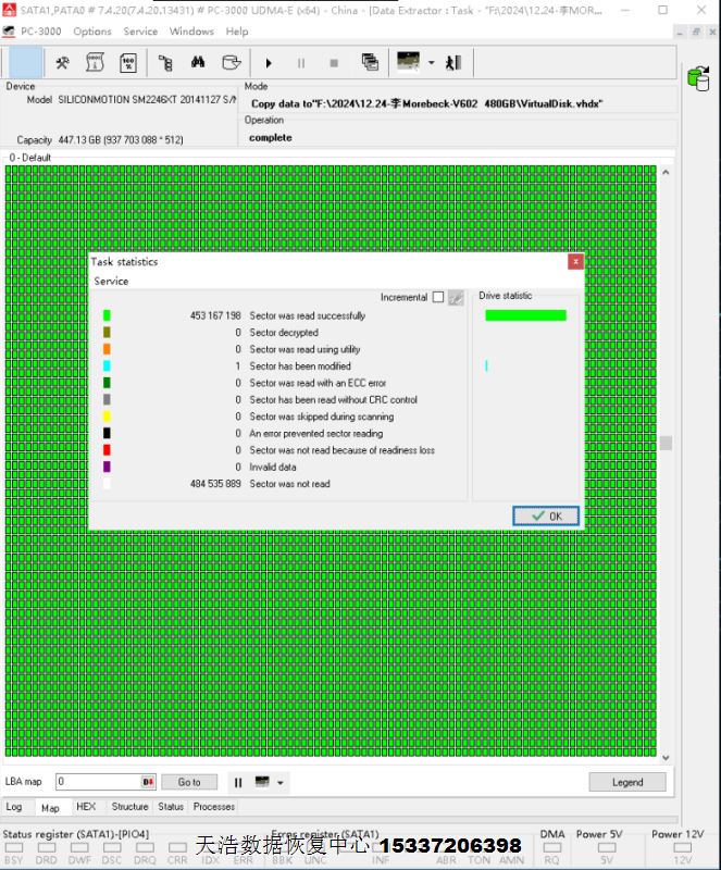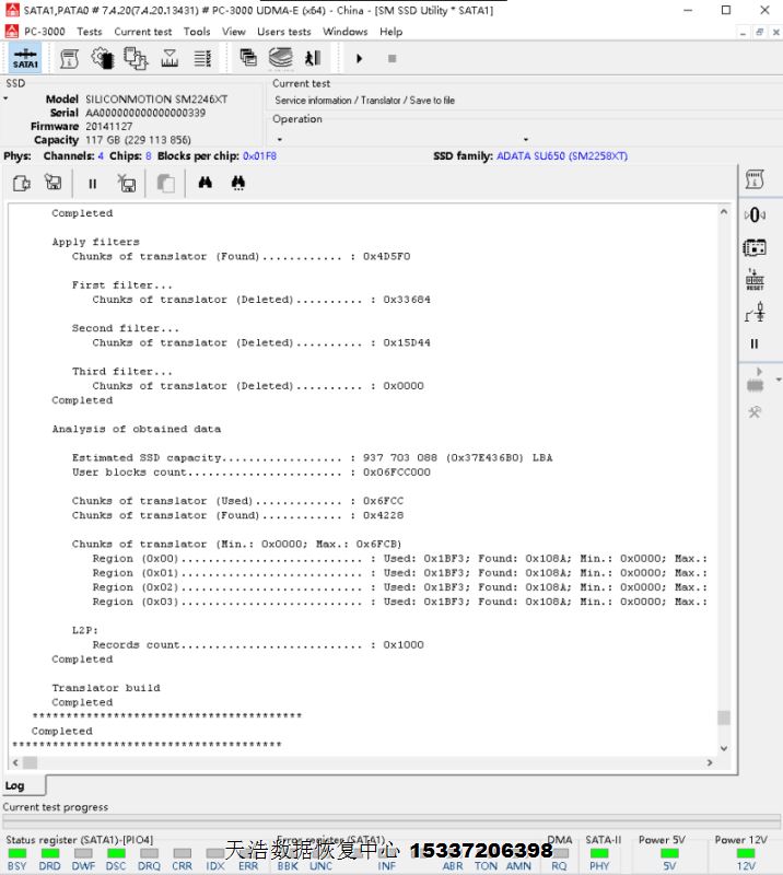 解决方案:收到硬盘后,我们使用专业的SSD恢复工具ACE PC-3000 UDMA Express,短接通电就绪后,虚拟重建编译器,再用PC3000 DE虚拟镜像,成功恢复客户硬盘内几乎全部重要数据。