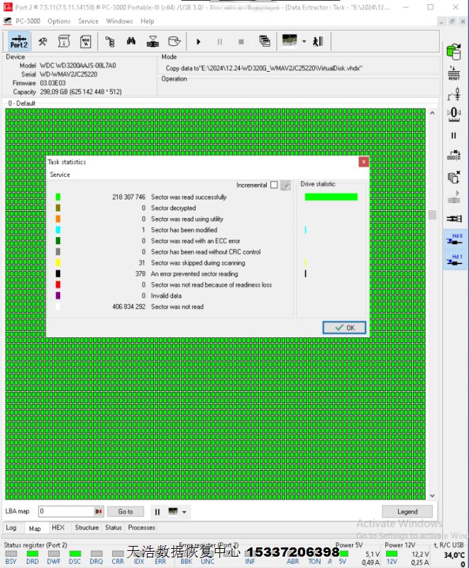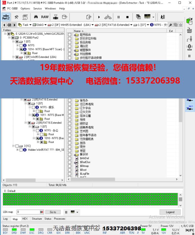 解决方案:收到硬盘后,我们在无尘环境拆开硬盘,发现磁头变形,盘片有轻伤,清洗盘片后更换兼容的磁头,再接到专业数据恢复工具PC3000 UDMA EXPRESS上,通电硬盘正常认盘,做好固件备份及常规固件处理工作后,DE分头镜像,最后客户硬盘内重要数据大部分成功恢复!