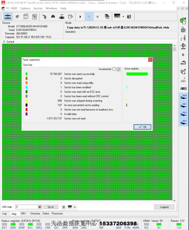 解决方案:收到硬盘后,我们在无尘环境更换兼容的磁头,接到专业数据恢复工具PC-3000 UDMA Express上,通电硬盘正常认盘,备份好固件,做好镜像前的处理准备工作后,DE分头镜像,最后成功恢复硬盘内几乎全部重要数据!