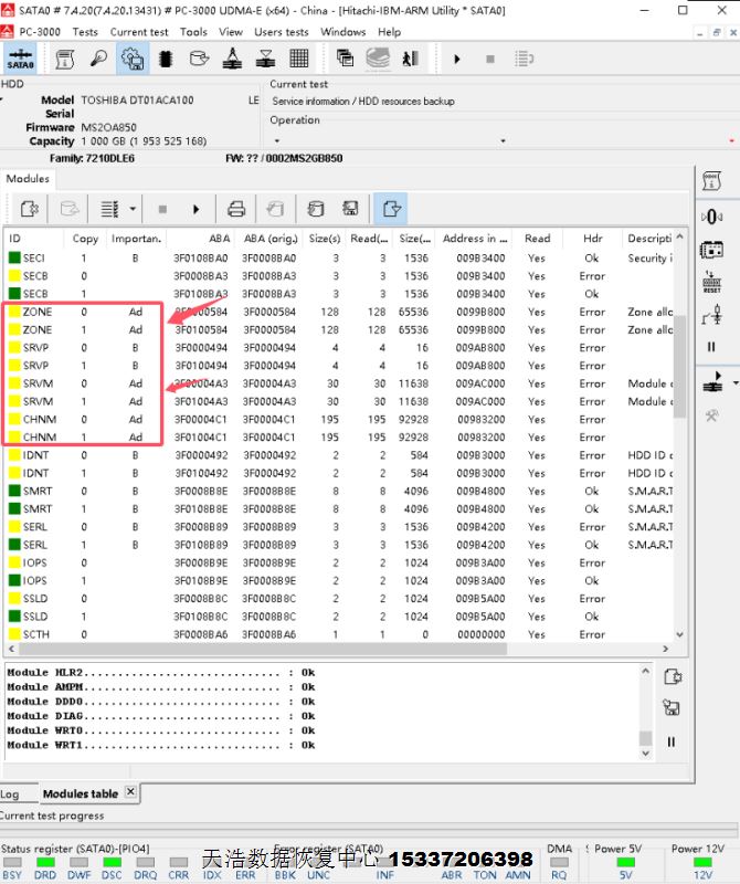 故障现象:东芝1T台式机硬盘不认盘,虚拟加载后,A级模块基本2份都损坏!