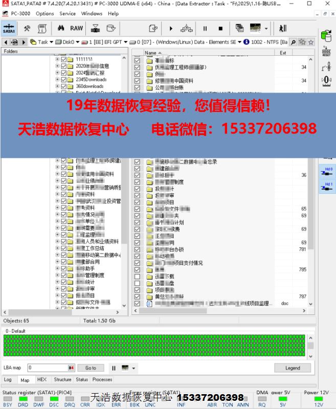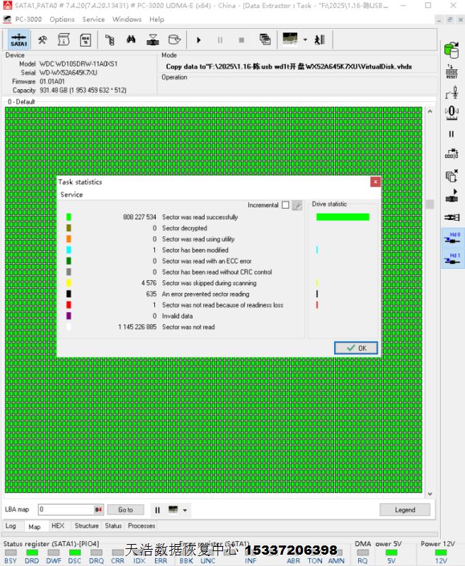 解决方案:收到硬盘后,在无尘环境更换兼容的磁头,对原始usb板解锁,飞线改SATA,接到专业数据恢复工具PC3000 UDMA EXPRESS上,通电硬盘正常认盘,备份好固件,做好前期处理工作后,DE分头镜像,最后客户硬盘内的重要数据绝大部分都成功恢复!