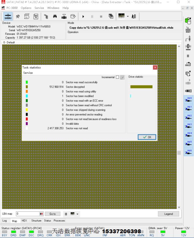 解决方案:收到硬盘后,在无尘环境更换兼容的磁头,更换兼容的SATA电路板,接到专业数据恢复工具PC3000 UDMA EXPRESS上,通电硬盘认盘,备份检测固件后,做好前期处理工作后,DE分头解密镜像,最后客户硬盘内的重要数据完美恢复!