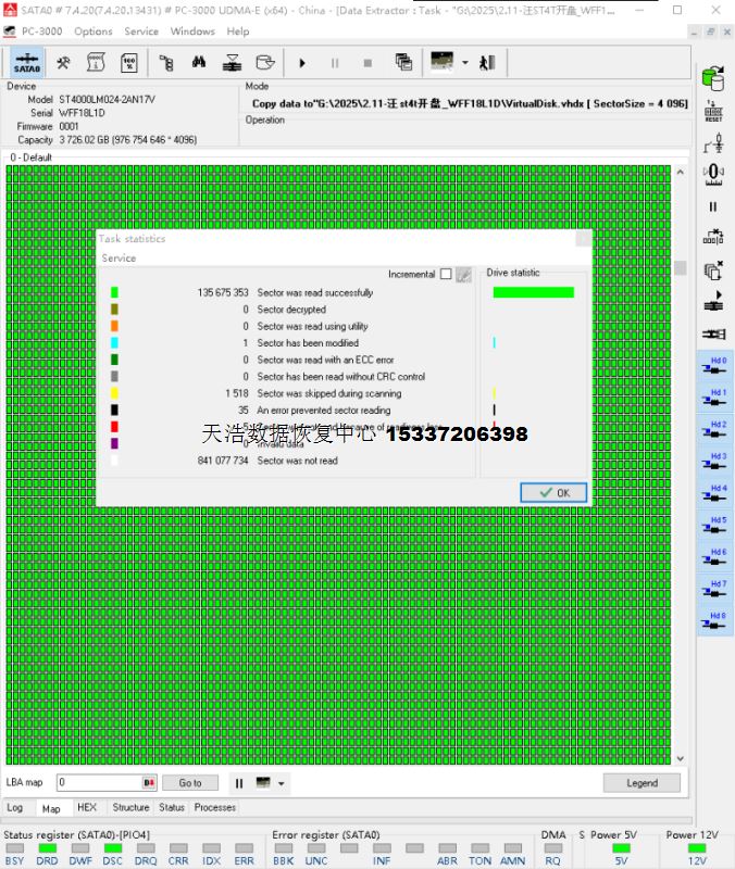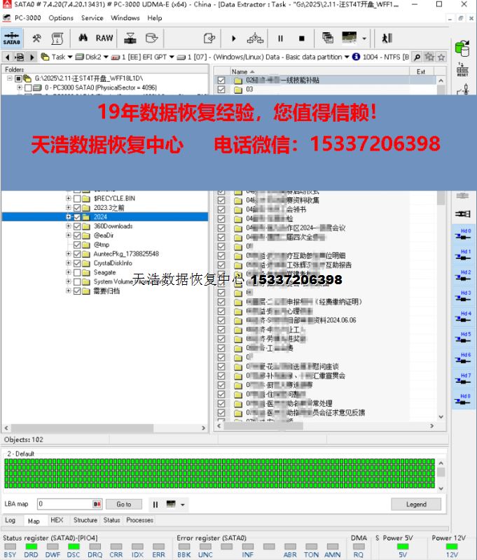 解决方案:收到硬盘后,在无尘环境更换兼容的碰头,接到数据恢复工具PC-3000 UDMA Express上,硬盘正常认盘,数据区前后都能正常访问,备份好固件,做好镜像前的处理工作,DE分头镜像,成功恢复客户硬盘内几乎全部重要数据!