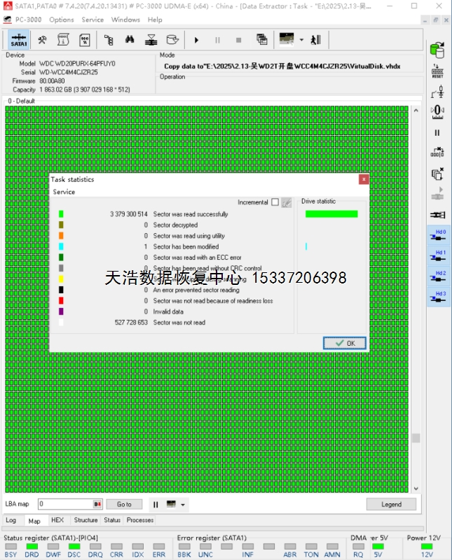 解决方案:收到硬盘后,在无尘环境更换兼容的磁头,再接到专业数据恢复工具ACE PC3000 UDMA EXPRESS上,通电硬盘正常认盘,备份好关键固件,做数据恢复前的处理工作后,DE分头镜像,成功恢复硬盘内客户单位的几乎全部重要数据!