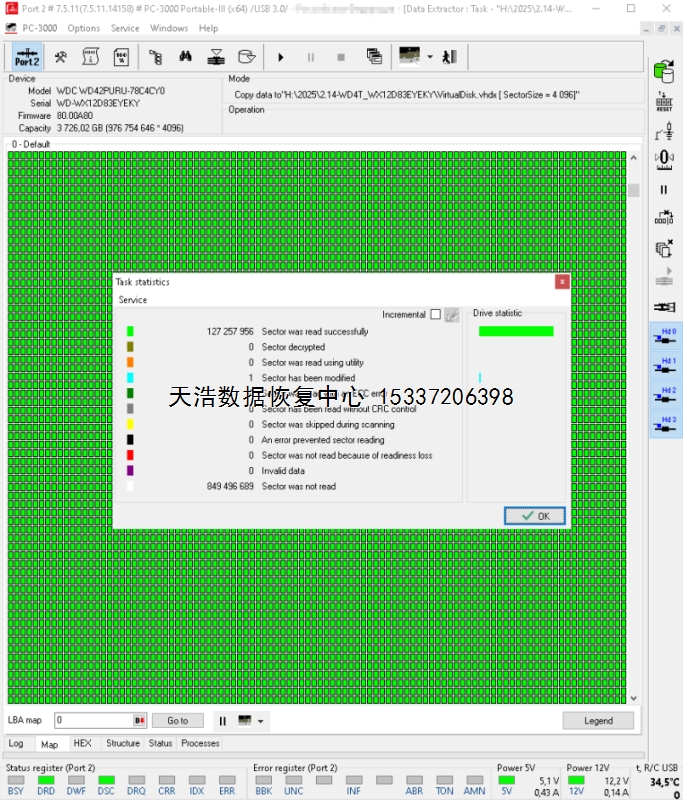 解决方案:收到硬盘后,在无尘环境更换兼容的磁头,接到专业数据恢复工具ACE PC-3000 UDMA Express上,原板解锁,通电检测、修复固件后,硬盘正常认盘,DE分头镜像,成功恢复硬盘内客户公司几乎全部数据!