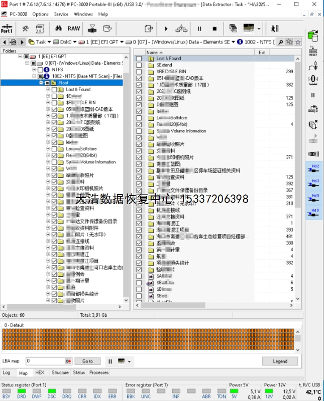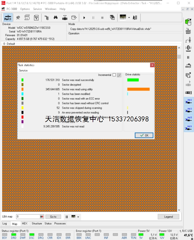解决方案:收到硬盘后,我们对原始ROM解锁,再usb板飞线改SATA,在无尘环境更换兼容的磁头,接到专业数据恢复工具ACE PC-3000 Portable III 上,通电硬盘声音正常认盘,备份固件,做好镜像前的处理工作后,DE分头镜像,最后客户硬盘内重要数据基本完美恢复!