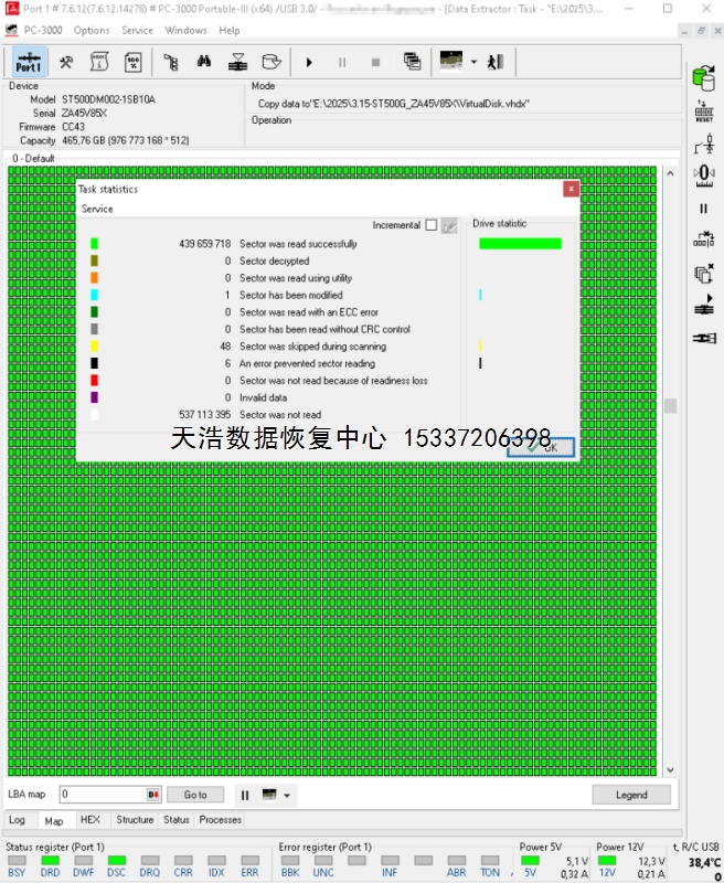 解决方案:收到硬盘后,在无尘环境开盘,更换兼容的磁头,接到数据恢复工具ACE PC-3000 UDMA Express上,通电认盘,DE分头镜像,最后客户硬盘内的重要数据基本完整恢复