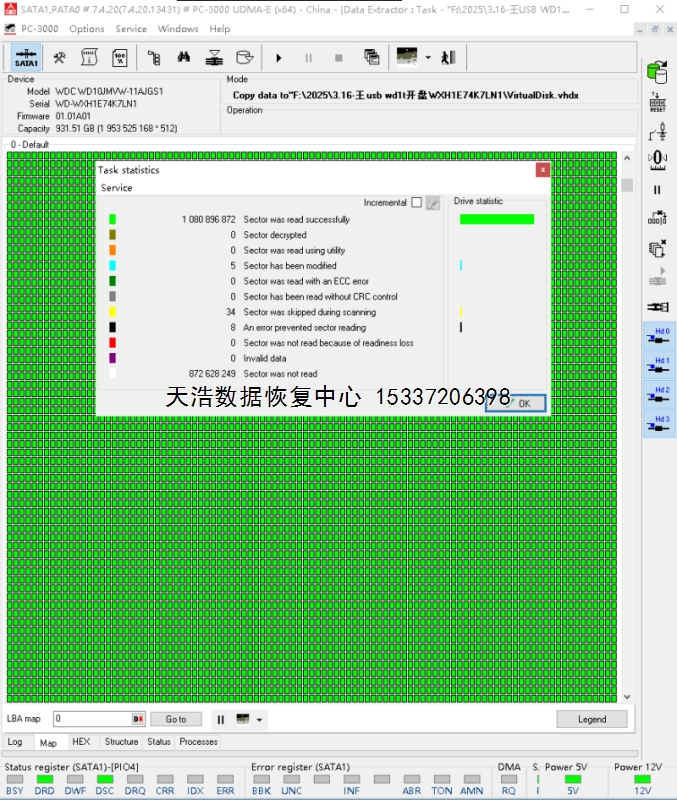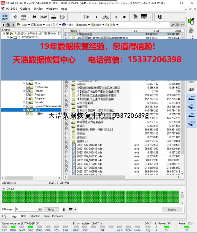 解决方案:收到硬盘后,在无尘环境更换兼容的磁头,再更换兼容的SATA电路板,接到专业数据恢复工具PC3000 UDMA EXPRESS上,通电硬盘认盘,备份固件,做好前期处理工作后,DE分头镜像,最后客户硬盘内的重要数据基本完美恢复!