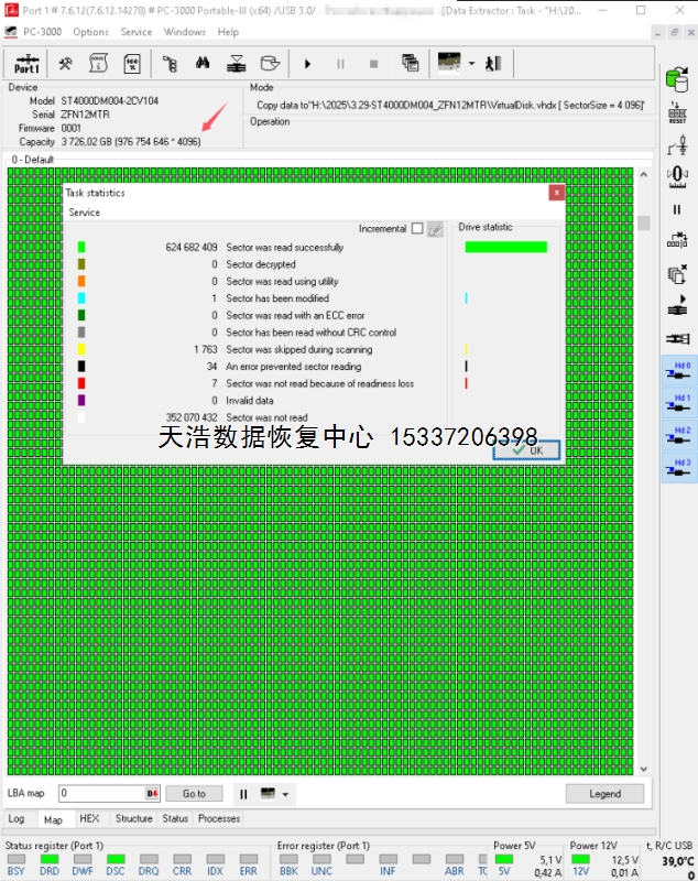 解决方案:收到硬盘后,在无尘环境拆开硬盘,检测发现盘片1面有轻伤,清洗盘片后,更换兼容的磁头,接到数据恢复工具ACE PC3000 UDMA EXPRESS上,通电认盘,备份固件后,做好恢复前的准备工作后,DE分头镜像,最后客户硬盘内重要数据基本完美恢复!