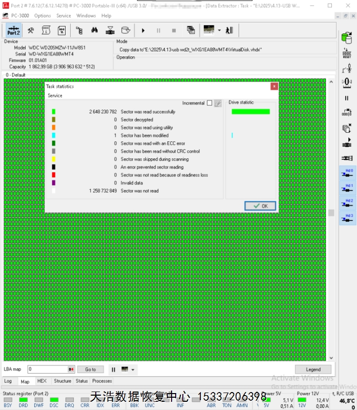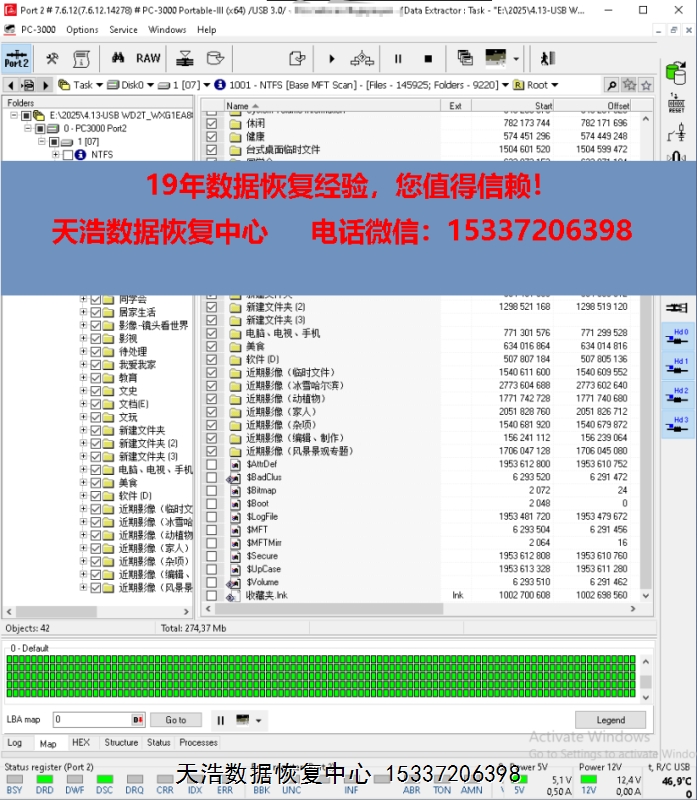 解决方案:收到硬盘后,在无尘环境更换兼容的磁头,原始usb板飞线改SATA,接到专业数据恢复工具ACE PC-3000 Portable III上,通电硬盘认盘,备份好关键固件,做好前期处理工作后,DE分头镜像,最后客户硬盘内的重要数据基本完整恢复!