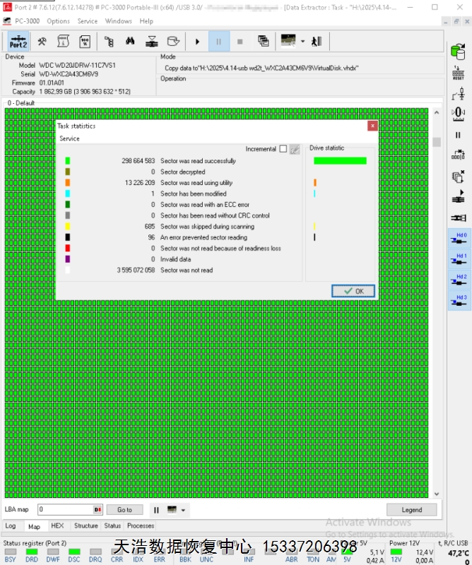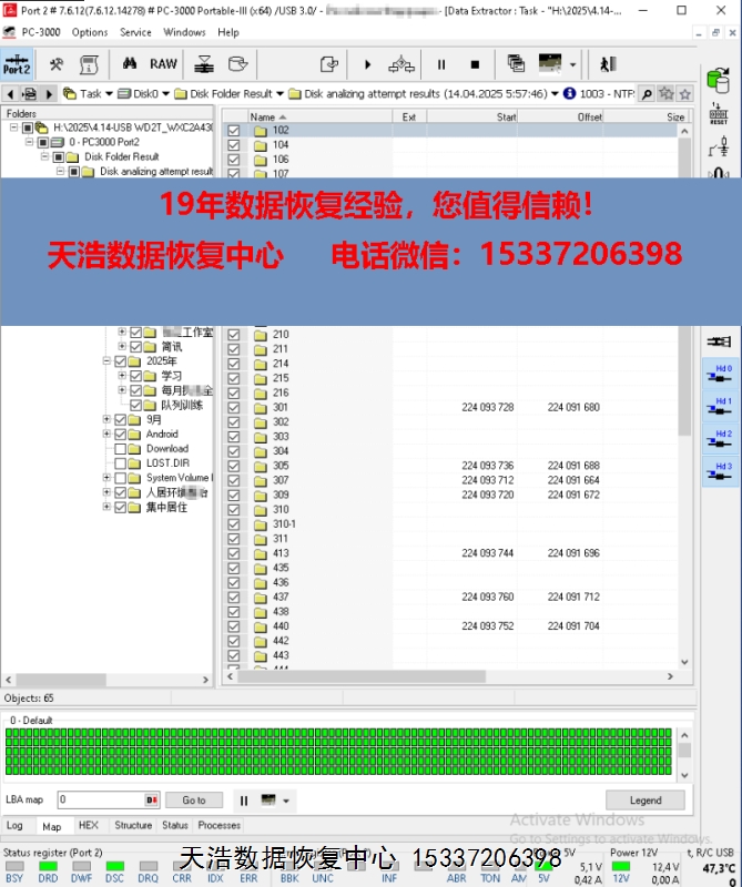 解决方案:收到硬盘后,在无尘环境更换兼容的磁头,原始usb板飞线改SATA,接到专业数据恢复工具ACE PC-3000 Portable III上,通电硬盘认盘,备份好关键固件,做好前期处理工作后,DE分头镜像,最后客户硬盘内的重要数据基本完整恢复!