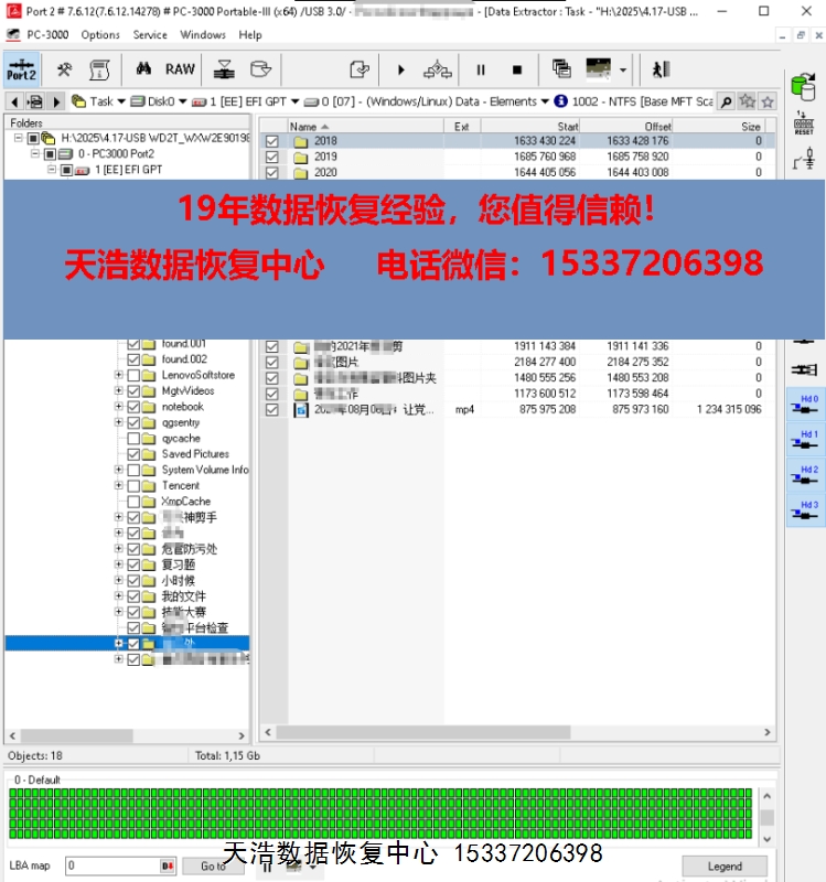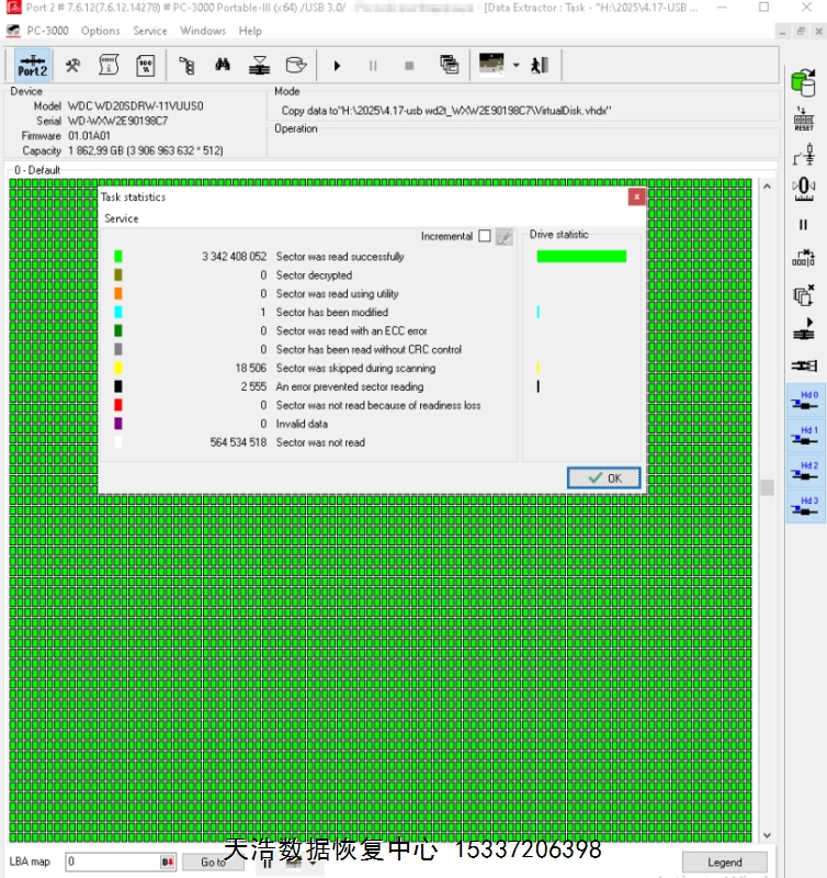 解决方案:收到硬盘后,在无尘环境更换兼容的磁头,原ROM解锁,原始usb板飞线改SATA,接到专业数据恢复工具ACE PC-3000 Portable III上,通电硬盘认盘,备份好关键固件,做好前期处理工作后,DE分头镜像,最后客户硬盘内的1.6T重要数据基本完整恢复!