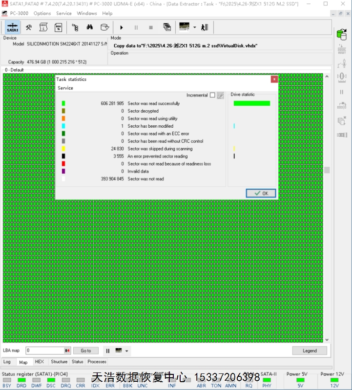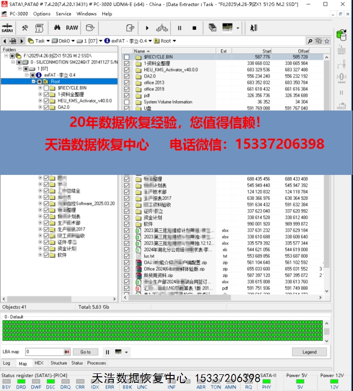 解决方案:收到硬盘后,我们使用专业的SSD恢复工具ACE PC-3000 UDMA Express,短接通电就绪后,虚拟重建编译器,再用PC3000 DE虚拟镜像,成功恢复客户硬盘内大部分重要数据!
