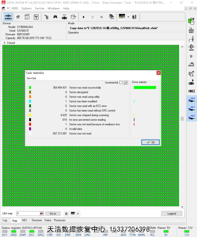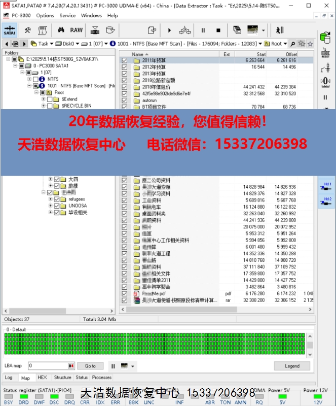 解决方案:收到硬盘后,在无尘环境开盘,更换兼容的磁头,接到数据恢复工具ACE PC-3000 UDMA Express上,通电认盘,DE分头镜像,最后客户硬盘内的重要数据大部分成功恢复!