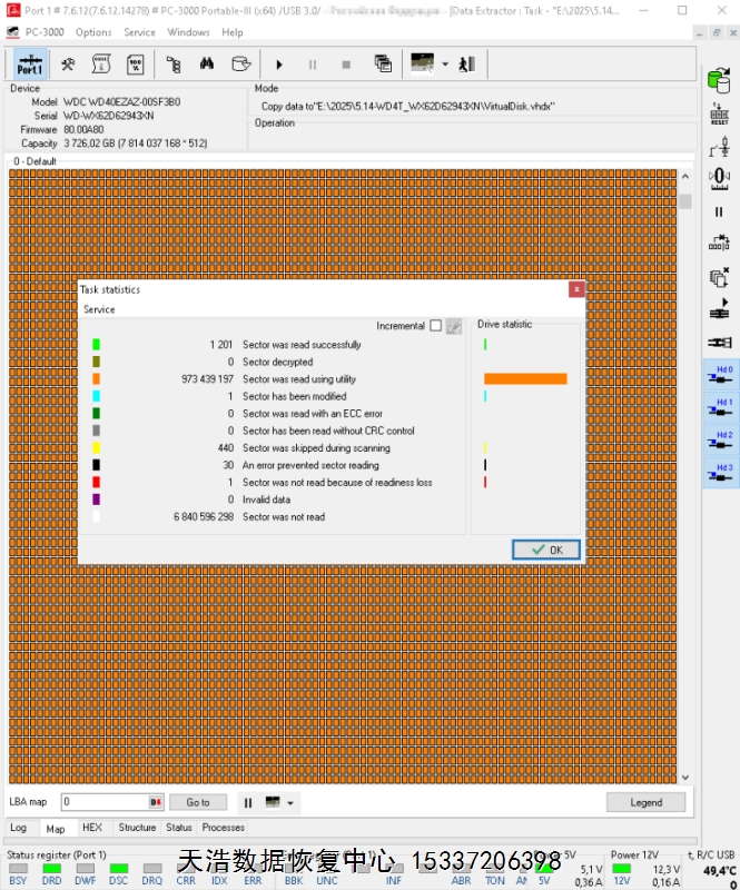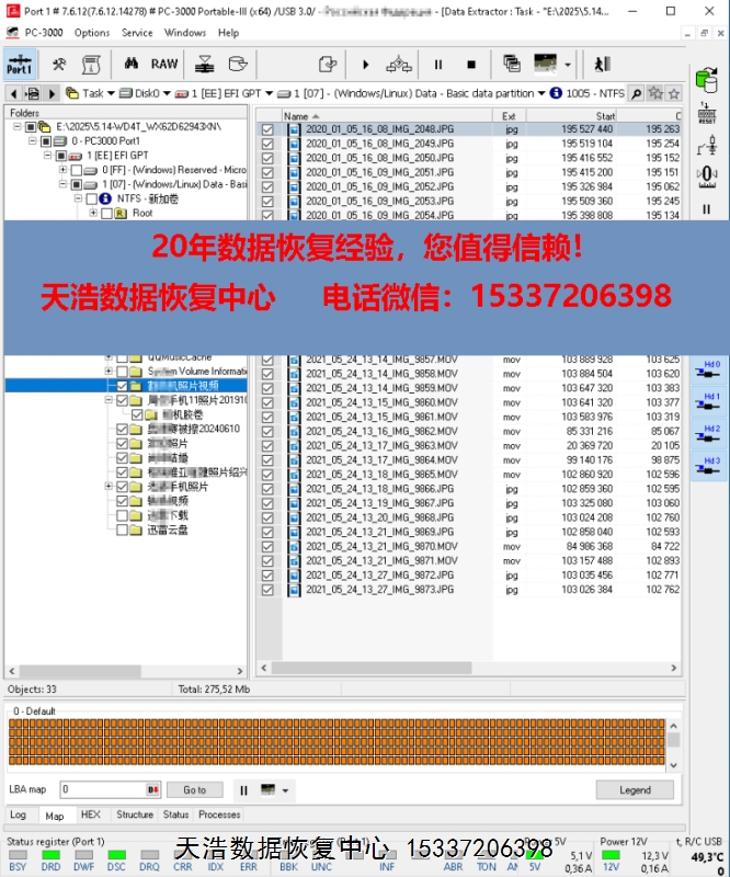 解决方案:收到硬盘后,接到专业数据恢复工具ACE PC-3000 Portable III上,通电检测、备份固件后,根据原盘信息,找到兼容的配件,在无尘环境更换兼容的磁头后,DE分头镜像,发现所有面的数据都能正常镜像,最后成功恢复硬盘内几乎全部数据!