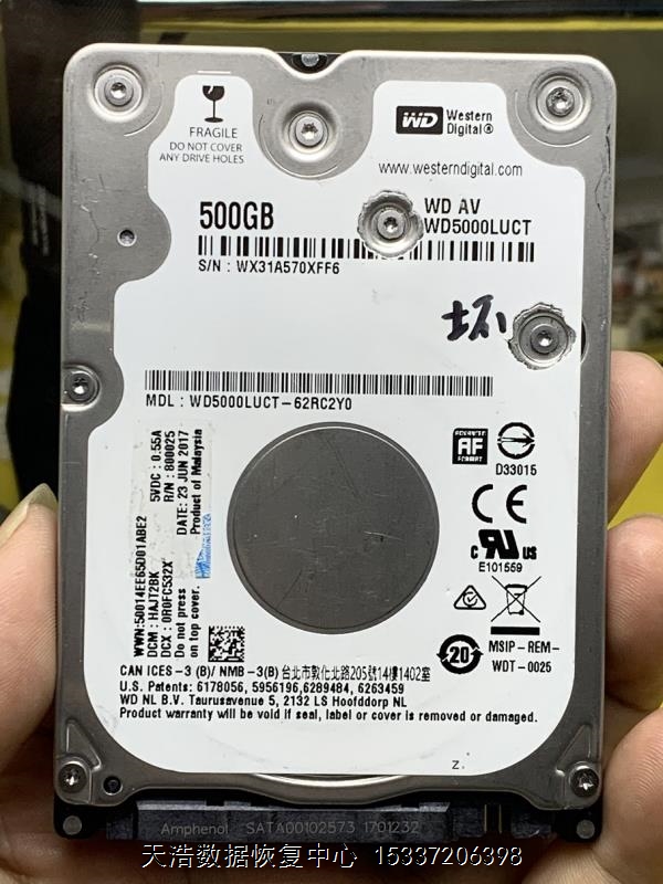 硬盘型号:WD5000LUCT-62RC2Y0 SN:WX31A570XFF6 FW:3003V 电路板号:800025-001