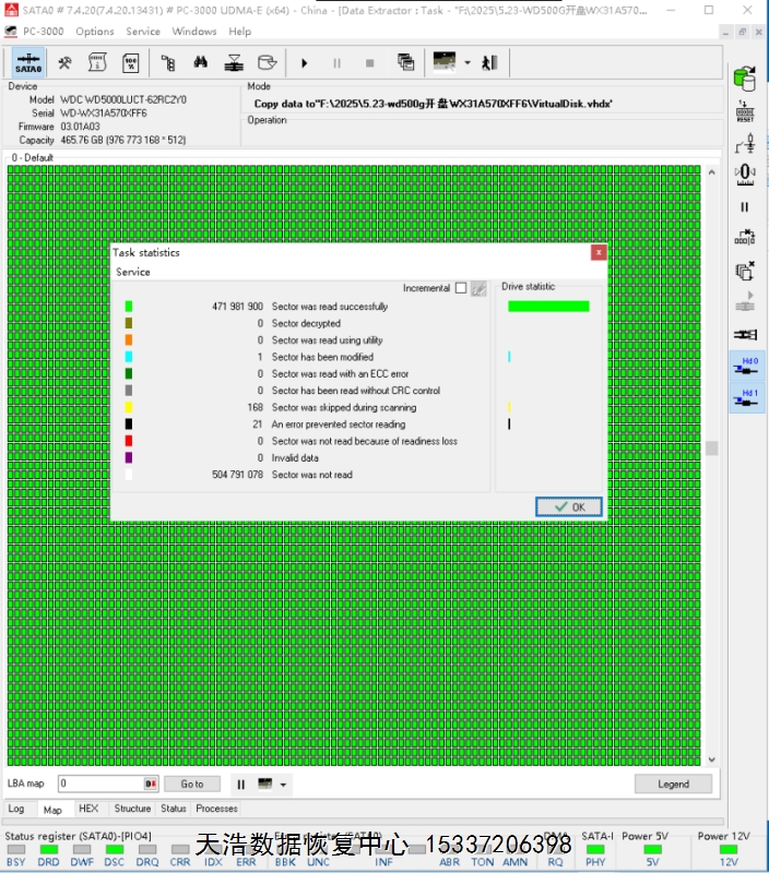 解决方案:收到硬盘后,在无尘环境更换兼容的磁头,接到专业数据恢复工具ACE PC3000 UDMA EXPRESS上,通电硬盘认盘,备份好关键固件,做好前期处理工作后,DE分头镜像,最后客户硬盘内的影楼照片基本完整恢复!