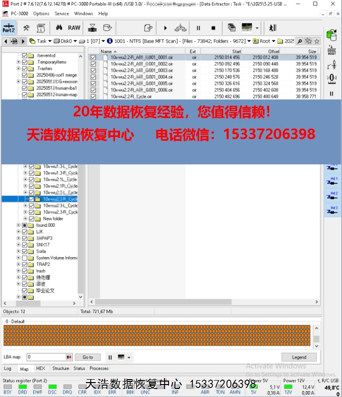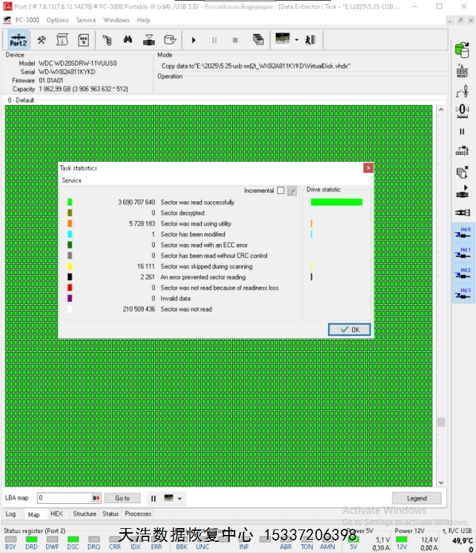 解决方案:收到硬盘后,我们在无尘环境开盘,更换兼容的磁头,原始usb板解锁飞线改SATA,接到专业数据恢复工具ACE PC-3000 Portable III上,通电硬盘正常认盘,备份好关键固件后,做好镜像前的处理工作后,DE分头镜像,最后客户硬盘内重要数据大部分成功恢复!