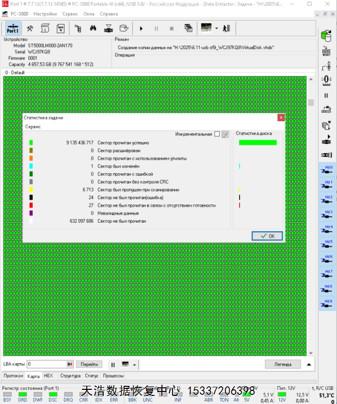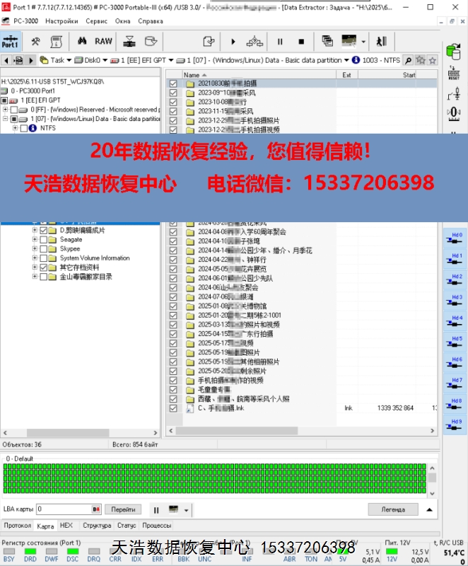 解决方案:收到硬盘后,在无尘环境开盘,更换兼容的碰头,接到数据恢复工具ACE PC-3000 Portable III上,硬盘正常认盘,数据区前后都能正常访问,备份好固件,做好镜像前的处理工作,DE分头镜像,成功恢复客户硬盘内几乎全部重要数据!