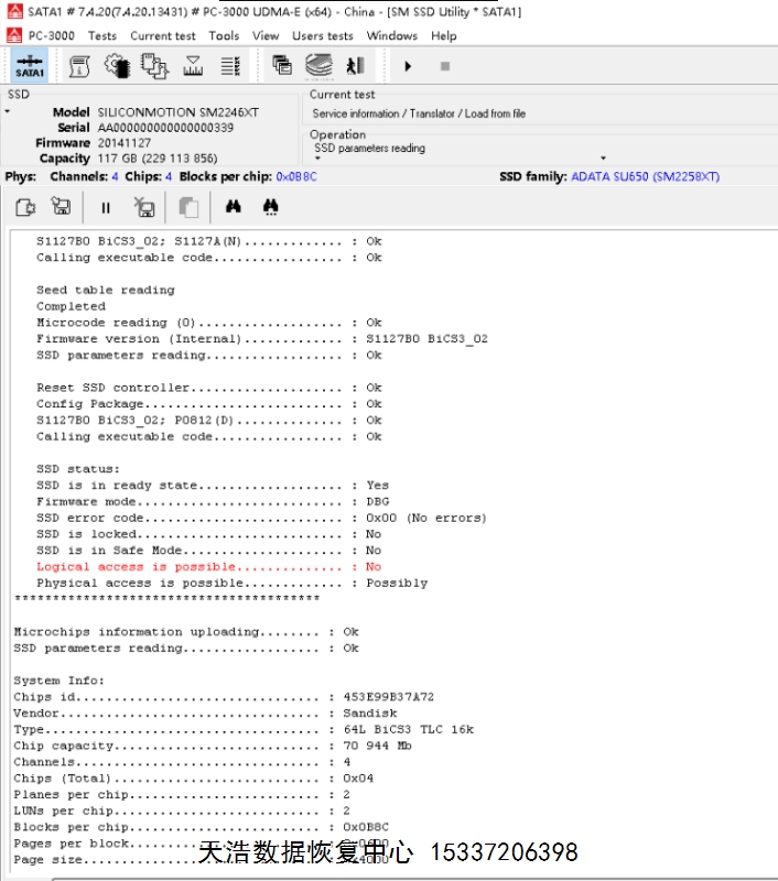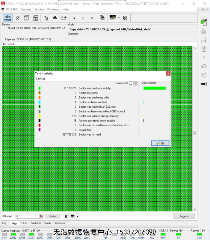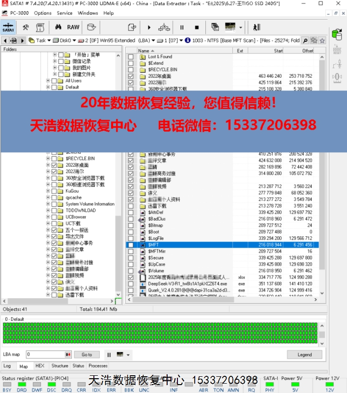解决方案:收到硬盘后,我们使用专业的SSD恢复工具ACE PC-3000 UDMA Express,短接通电就绪后,虚拟重建编译器,再用PC3000 DE虚拟镜像,基本完整成功恢复出客户硬盘内的重要数据!