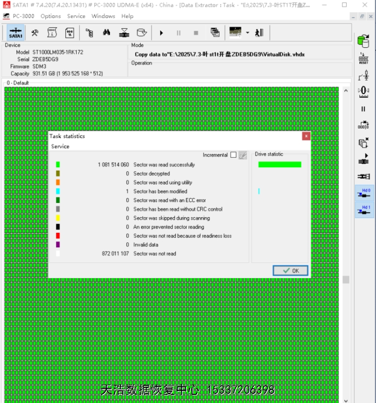 解决方案:收到硬盘后,在无尘环境拆开硬盘,更换兼容的磁头,接到数据恢复工具ACE PC-3000 UDMA Express上,通电硬盘正常认盘,备份关键固件,做好镜像前的处理工作,DE分头镜像,最后客户硬盘内的数据基本完美恢复!
